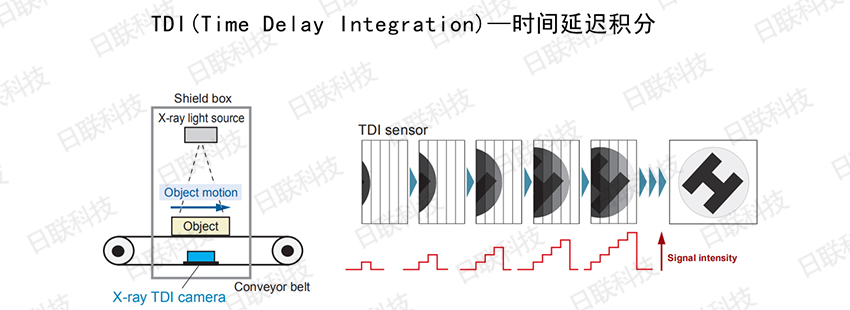就普通線(xiàn)陣成像器來(lái)說(shuō),線(xiàn)陣成像器的成像區(qū)域如第一幅圖,可以理解為一條線(xiàn),但TDI則不止,它有好幾條線(xiàn)并列來(lái)進(jìn)行成像,如上圖右邊TDI sensor中有五條線(xiàn),當(dāng)物體移動(dòng)時(shí)每條線(xiàn)都在取圖,**進(jìn)行整合。可以簡(jiǎn)單理解為:多條線(xiàn)陣,每條線(xiàn)陣檢測(cè)取圖后將數(shù)據(jù)疊加,可以看作物體被檢測(cè)曝光了多次,增加了有效信息,因此相較傳統(tǒng)LDA動(dòng)態(tài)范圍寬,響應(yīng)度高,且即使在光線(xiàn)較暗的場(chǎng)所,也能輸出質(zhì)量較高的圖像。