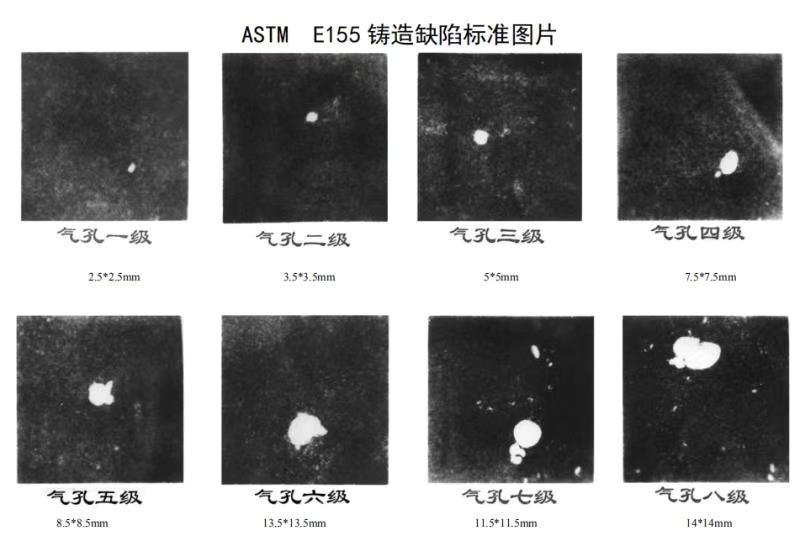 工業(yè)件體積大,探測(cè)面積也大,個(gè)別不在關(guān)鍵位置的小氣孔對(duì)鑄件的影響其實(shí)并不大,那為何還要進(jìn)行X射線無(wú)損檢測(cè)呢?其實(shí)檢測(cè)的目的并不是僅僅發(fā)現(xiàn)小氣孔,而是檢測(cè)其內(nèi)部是否存在連成一片密集的疏松面,這樣的缺陷就比較嚴(yán)重。國(guó)內(nèi)工業(yè)起步較早,國(guó)內(nèi)、國(guó)際的相關(guān)標(biāo)準(zhǔn)也比較完善,下面是STM的國(guó)際鑄造缺陷圖,它是一個(gè)用來(lái)衡量缺陷的標(biāo)準(zhǔn)。