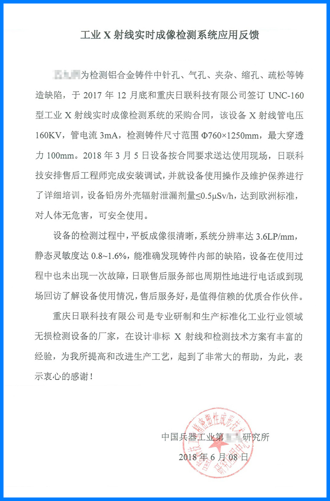 近日,日聯(lián)科技收到了中國(guó)兵器工業(yè)集團(tuán)反饋的用戶使用報(bào)告。在該報(bào)告中,中國(guó)兵器工業(yè)集團(tuán)對(duì)我司設(shè)備穩(wěn)定可靠的工作性能、專業(yè)細(xì)致的售后服務(wù)、完善詳盡的操作培訓(xùn)給予了高度的認(rèn)可和評(píng)價(jià),并重點(diǎn)指出我們的UNC160工業(yè)X射線實(shí)時(shí)成像檢測(cè)設(shè)備能準(zhǔn)確發(fā)現(xiàn)鑄件的內(nèi)部缺陷,為他們產(chǎn)品質(zhì)量的提高和生產(chǎn)工業(yè)的改進(jìn)提供了可靠保障,稱贊我們?nèi)章?lián)科技為值得信賴的企業(yè)合作伙伴。